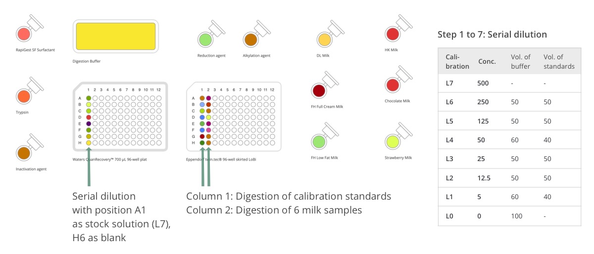 Bottom-up proteomics is a valuable approach for discovering signature peptides to identify specific proteins found in food. However, food is a complex matrix that requires extensive sample preparation before analysis. Figure 1 below shows a typical 5-step workflow for tryptic protein digestion, which requires several repetitive additions of reagents. The preparation of calibration standards for quantitative analysis also adds to the pipetting tasks. Hence, it will be ideal to automate the whole process. In this tutorial method, we show an example of how to automate the protein digestion of milk samples using Andrew+ Pipetting Robot, as well as the serial dilution of calibration standards. The final mixture obtained will be ready for a typical quantitative LCMS analysis.