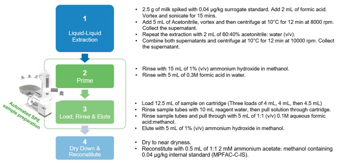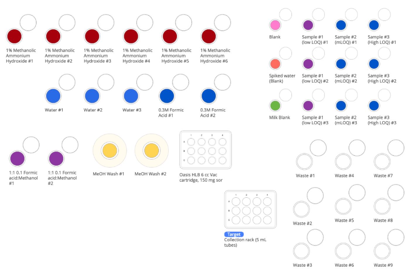 Preparing milk samples for analysis using an LC-MS/MS involves a 4-part workflow requiring many pipetting tasks and is a time-consuming process. It is, therefore, desirable to automate as many of the parts of the workflow to improve throughput and reduce human experimental errors. The protocol shown here automates the priming of Oasis GCB/WAX cartridges, loading, rinsing, and eluting of the sample, thus improving experimental efficiency while reducing errors.