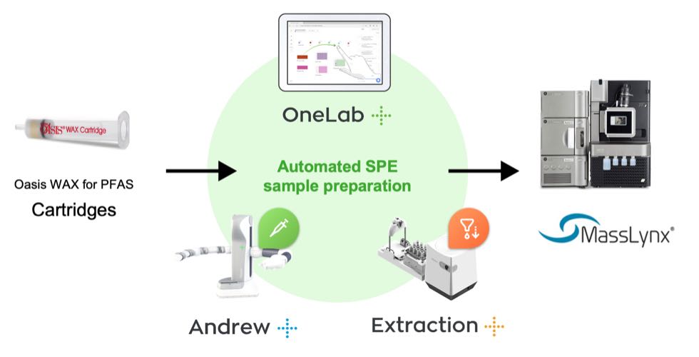 Figure 2: Graphical illustration of the automated SPE sample extraction and LC-MS analysis workflow using the Oasis GCB/WAX for PFAS 6 cc cartridges on the Andrew+ Pipetting Robot configured with the Extraction+ Connected Device.