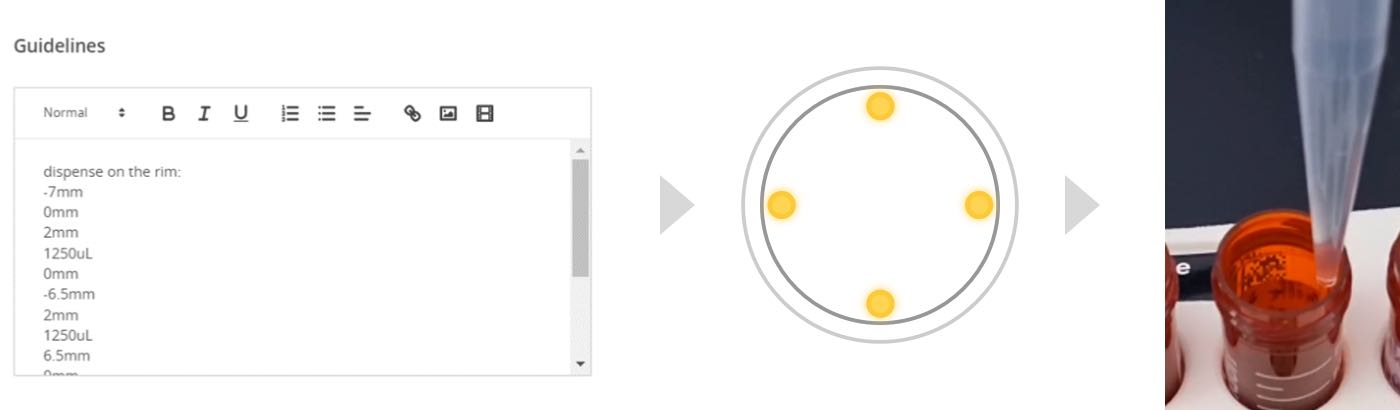 Figure 3: Andrew+ Guidelines to dispense along the rim (left), the 4 positions of solvent dispensing (center) and dispensing along the rim (right).