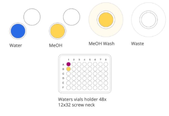 The solution in position A1 of the 48x rack is labeled “Native A.” It is made up of 100 µg/kg of PFAC30PAR, L-PFUdS, L-PFDoS, and L-PFTrDS. If required, this solution will need to be manually made up.