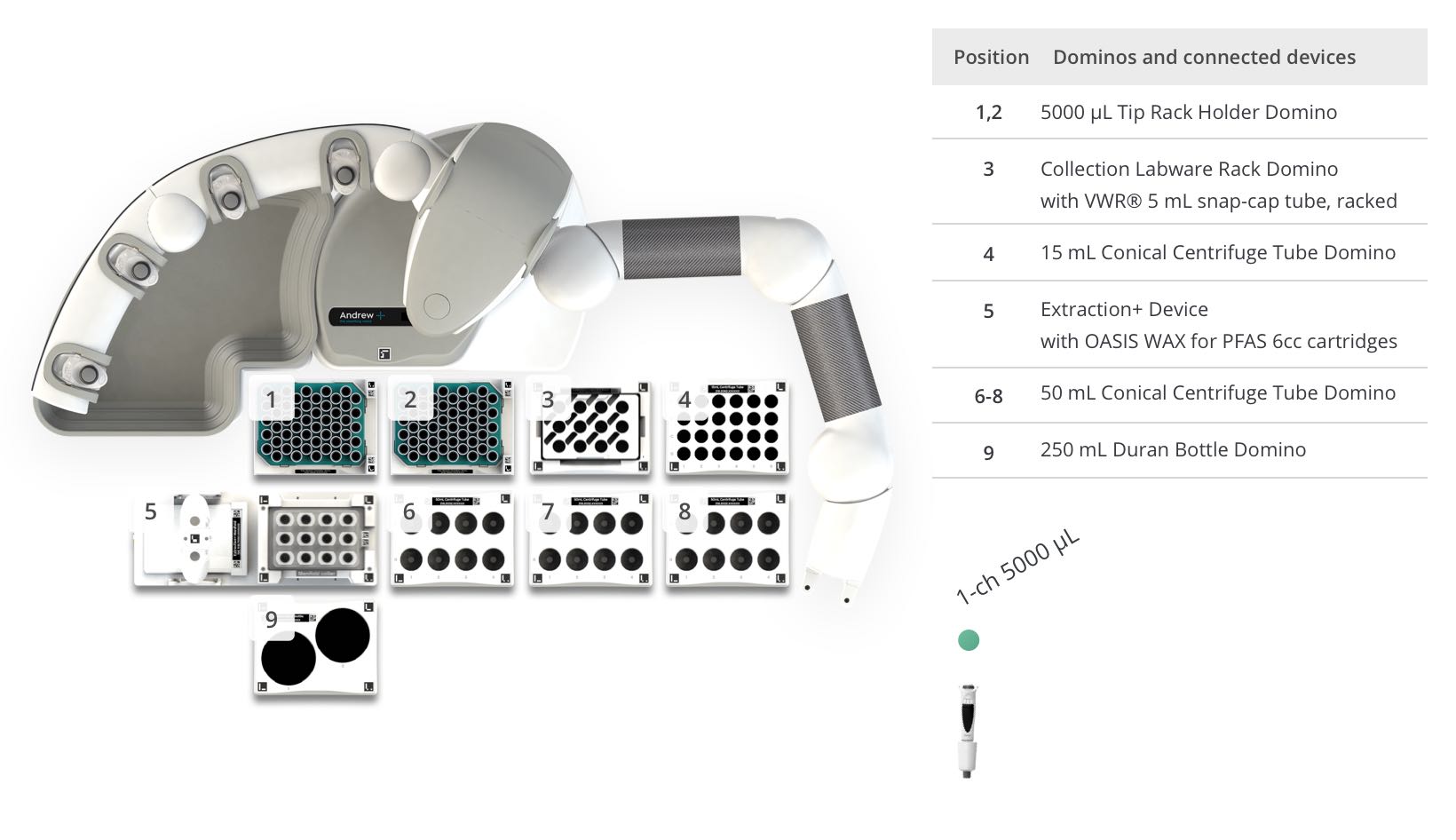 Figure 7: Andrew+ OneLab deck set up for the automated “Preparation of PFAS samples in Milk” assay. Domino/Device locations on Andrew+ deck: [1 - 2] 5ml Tip Rack Holder Domino, [3] Collection Labware Rack Domino with Eppendorf® 5 mL snap-cap tube, racked, [4] 15ml Conical Centrifuge Tube Domino, [5] Extraction+ Device with Oasis WAX 6cc cartridges, [6 - 8] 50ml Conical Centrifuge Tube Domino, [9] 250ml Duran Bottle Domino