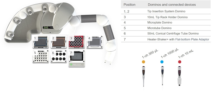 This example method provides a freely adjustable framework for measuring the adaptability of the OneLab environment to workflows from different application fields. It helps to understand various nuances of the code-free, universal protocol designer and provides general indications as to the feasibility of a project. Scripts generally require fine adjustment to correct for variables and support specific labware implementation.