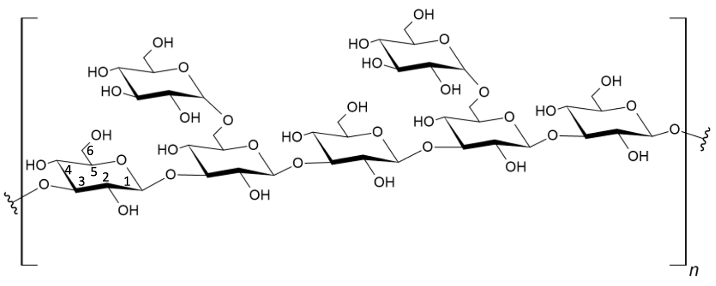 Figure 1: Common (1→3)-β-D-glucan structure. The example shown is a (1→3)-β-D-glucan polymer chain with (1→6)-β-D-glucan branching. Glucan is a major constituent of the cell wall of most Fungi for example, similar molecules can be derived from Saccharomyces cerevisiae cell walls.