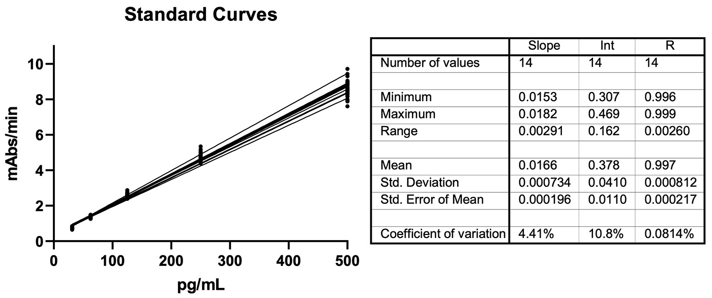 Figure 2: Example Fungitell® standard curves created by executing the protocol on the Andrew+ Pipetting Robot. There are fourteen separate standard curves included in this graph. Each curve has triplicates for each standard resulting in forty-two data points at each x-axis value. The 14 plates were collected by two people over 4 or more days using the Andrew+ robot. The standard curve comprises five points, 31.25, 62.5, 125, 250, and 500 pg/mL created by 2-fold serial dilution using Andrew+.