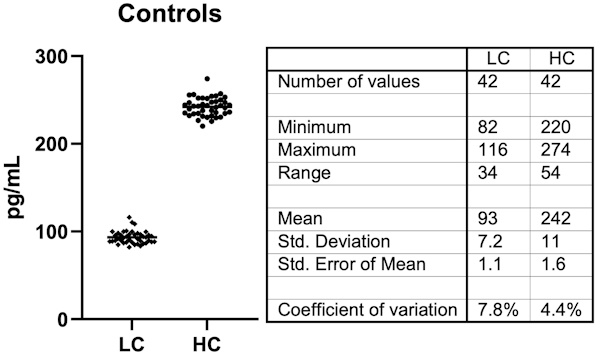 Figure 3: Example Fungitell® glucan serum control results using Andrew+. Controls were tested on each of the plates in Figure 2 in triplicate. The aggregate set of forty-two data points for each control was analyzed. LC is low control and HC is high control. Controls are serum-based samples spiked with glucan. A control or sample in this assay is created from three separate pipetting steps of 5, 20 and 100 µL in a single well.