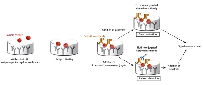 Figure 1: A schematic illustration of Sandwich ELISA highlighting two different detection systems; Direct using enzyme-conjugated detection antibody and indirect using the Streptavidin-enzyme conjugate to probe the biotinylated detection antibody.