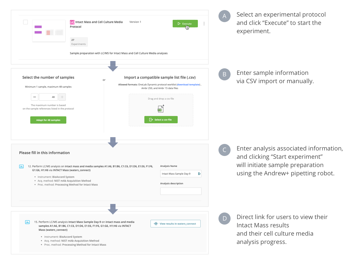 These protocols, as part of a walk-up solution, enable robust, routine LC-MS analysis in bioprocess laboratories. A single interface based on OneLab software provides a seamless connection between sample input, automated sample preparation, and LC-MS data acquisition and analysis (Figure 1).