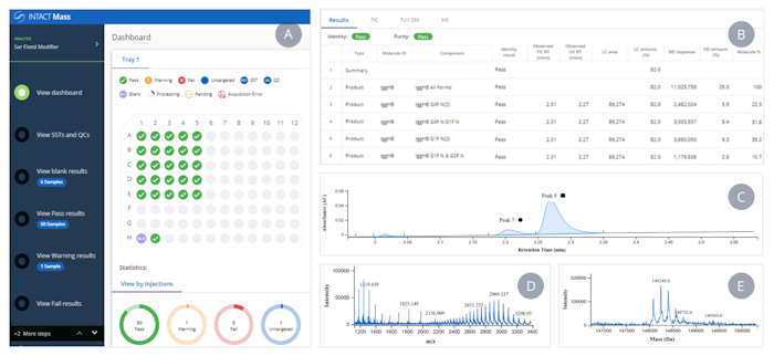 Figure 2: Intact Mass Dashboard. Results are displayed in a simple layout containing: a simple data review workflow and a plate map (A); major glycoforms reported per sample (B); and optionally access to chromatographic integrations and spectral data (C, D, E) for each sample.