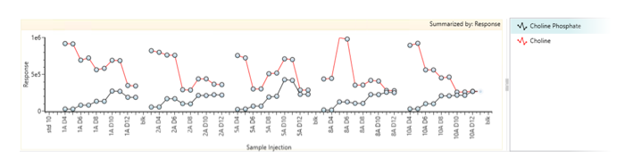 Figure 3: Example of overlaid trending plots (of choline and choline phosphate) across 5 bioreactors using the Cell Culture Media workflow.