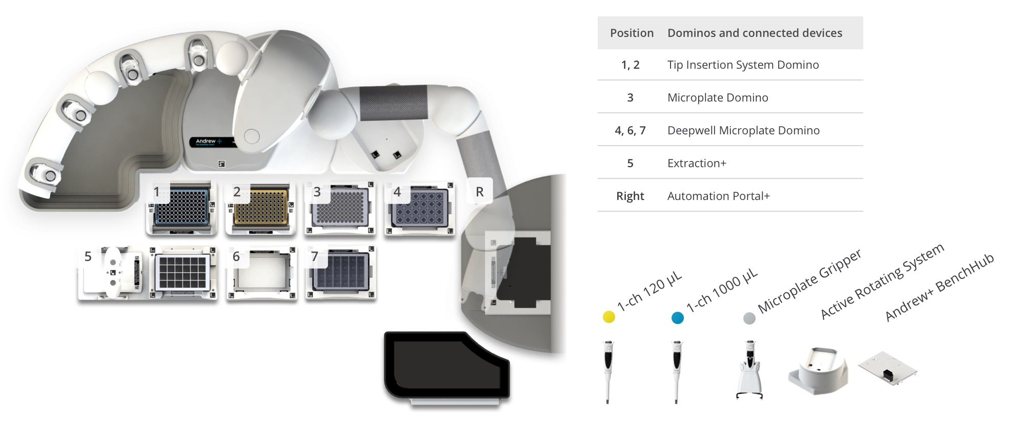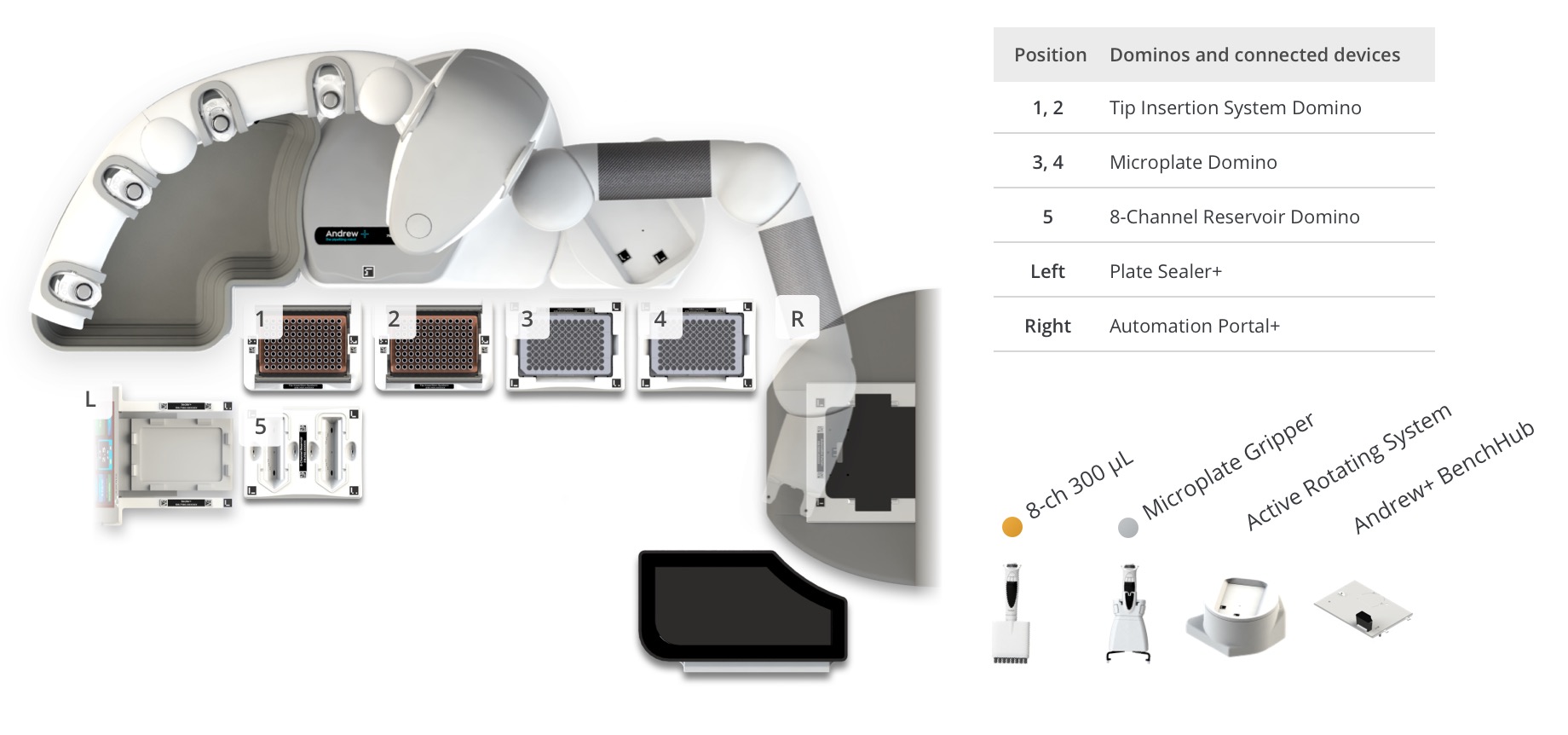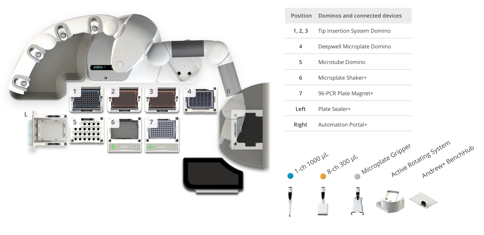 Andrew+ System Components: Dominos, Devices, Electronic Pipettes & Tips