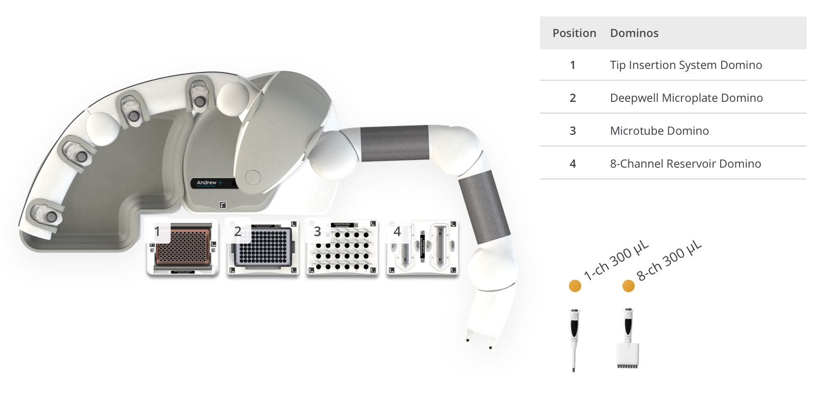 Andrew+ System Components: Dominos, Devices, Electronic Pipettes & Tips