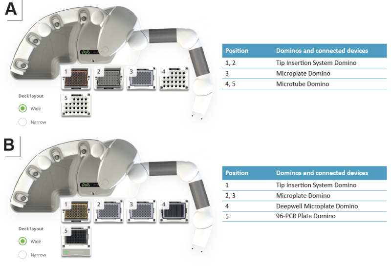 Figure 2: Domino/device positions on the Andrew+ working deck for (A) the “O-glycopeptide generation” protocol and (B) the “O-glycopeptide reduction and alkylation" protocol.
