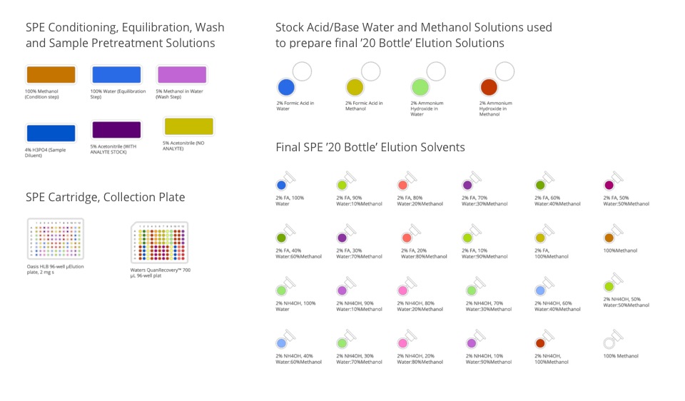 The 20-bottle SPE method optimization approach describes an elegant experimental design that varies the pH and the organic content of the elution solution to determine which condition provides the best probability of eluting the compound of interest from the sorbent bed. The elution solvent composition varies from 0-100% organic (generally methanol) with either 2% ammonium hydroxide or 2% formic acid. The acidic or basic nature of the elution solvent helps alter the pH, whereas the organic content helps dissociate analytes from the sorbent bed and improve solubility.