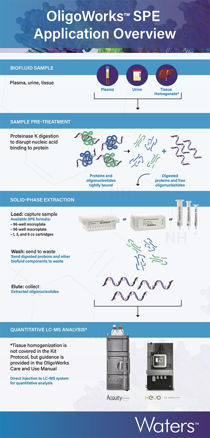 Waters OligoWorks™ SPE kits (and components) are designed to accelerate your oligonucleotide bioanalysis projects and shorten the gap between the delivery of samples to your lab and obtaining the high confidence results you need to understand dosing, metabolism, and tissue adsorption of a drug candidate.