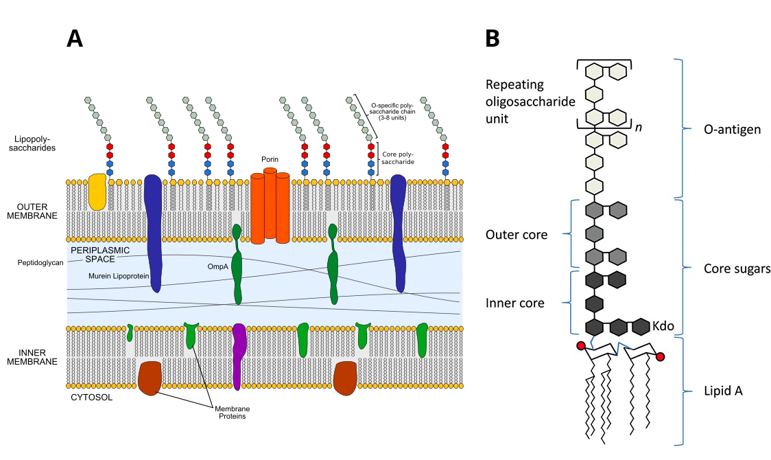 Figure 1: Endotoxin is a major constituent of the outer membrane of gram-negative bacteria. A) Gram-negative cell envelope © Jeff Dahl, CC BY-SA 4.0 via Wikimedia Commons (5). B) Endotoxin structural schematic, CC BY 3.0 (6).